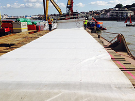 Once the drains had been installed, MMC Divers assisted in the placement of a geo-textile membrane that was laid on top of the sand and gravel layer. This process was achieved using a large barge and a multi-cat for the divers support vessel.